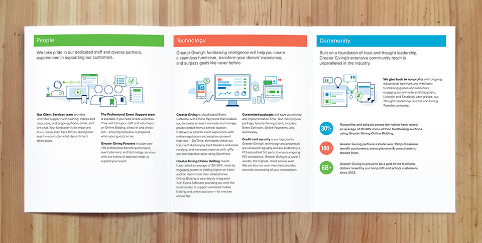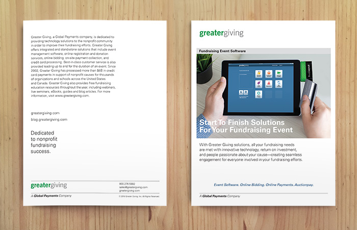 This promotional brochure is an original design which also adheres to brand guideline established by Greater Giving’s parent company, Global Payments.